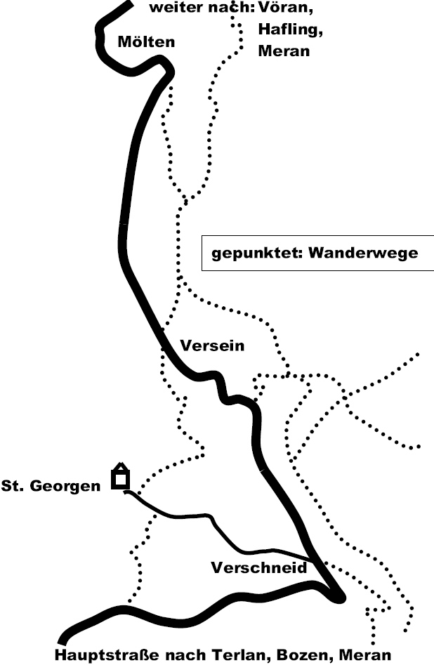 über eine gut ausgebaute Panoramastraße ab Terlan (Terlan liegt zwischen Bozen und Meran). Folgen Sie dem Hinweisschild nach Mölten! Nach 9 km erreichen Sie den Ortsteil Verschneid. An der Bushaltestelle (unterhalb der Kirche) links abbiegen und der Beschilderung nach St. Georgen folgen.